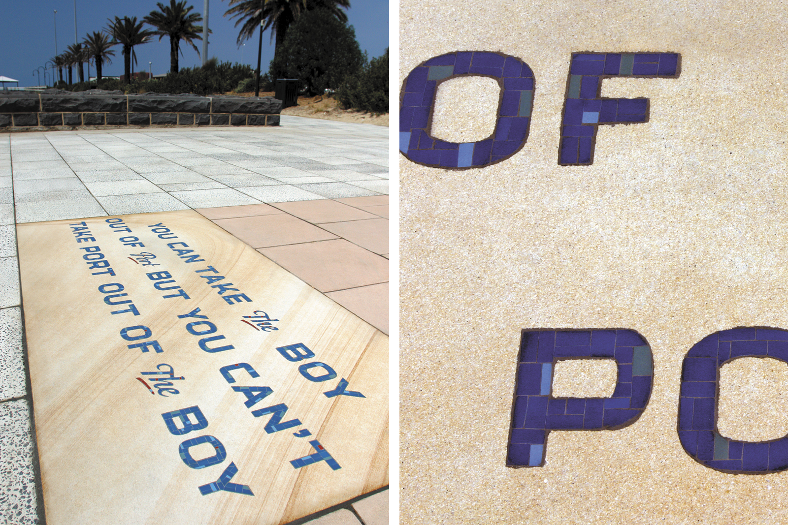 Five artworks were commissioned for seating alcoves along the promenade close to the walkway to the Port Melbourne pier, created in sandstone, in-filled with ceramic mosaic and sandblasted black granite. Typefaces were specifically designed for the project, inspired from historic references such as the neon lettering on the Mission to Seamen building.